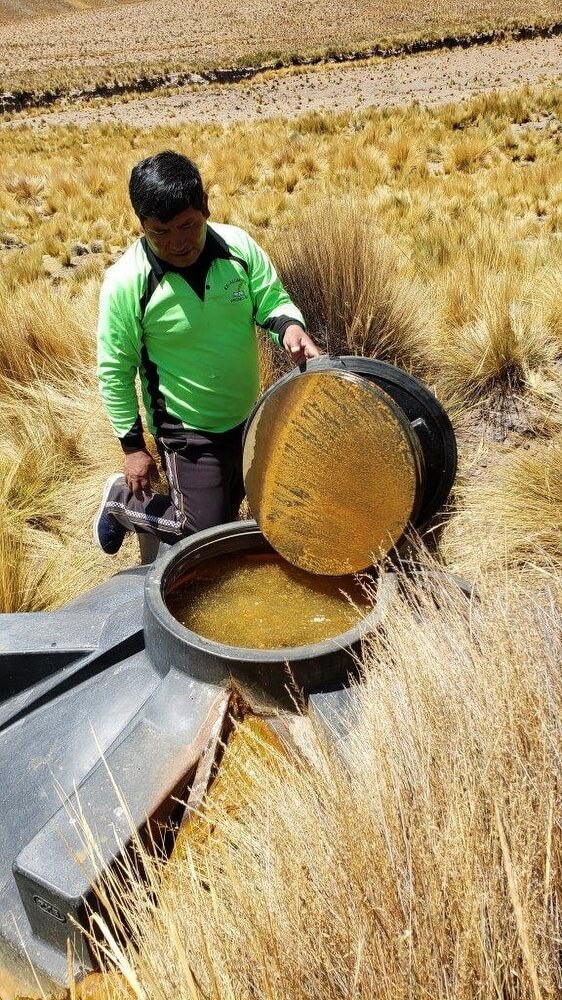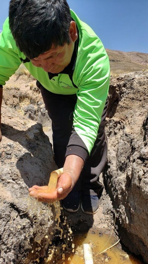De schoolkinderen en moeders in Laja Tambo verbouwen hun eigen groenten in de “aula verde” (het groene klaslokaal): de schoolkas die door Amigos de Potosí tezamen met de gemeenschap werd gebouwd in 2019. Onze lokale vrijwilliger Daysi begeleidt hen daarbij intensief en de moeders en leerkrachten kregen bovendien les in voedingsleer en het bereiden van de groenten. In 2020 werd een bewateringssysteem met watertank aangelegd, aangesloten op een natuurlijke bron. (Er is geen waterleiding). De laatste jaren is er echter een probleem ontstaan, het water is gelig en troebel, waardoor het filter van het netwerk en ook de druppelaars van de kas verstopt raakten. Leden van de gemeenschap schrijven het toe aan de mijnbouw in de regio, die waarschijnlijk het water op ondergrondse niveaus vervuild. De hangende kweekflessen in de kas zijn geel verkleurd, mogelijk bevat het water uit deze bron, waar de hele gemeenschap gebruik van maakt, minerale vervuiling: waarschijnlijk ijzer.